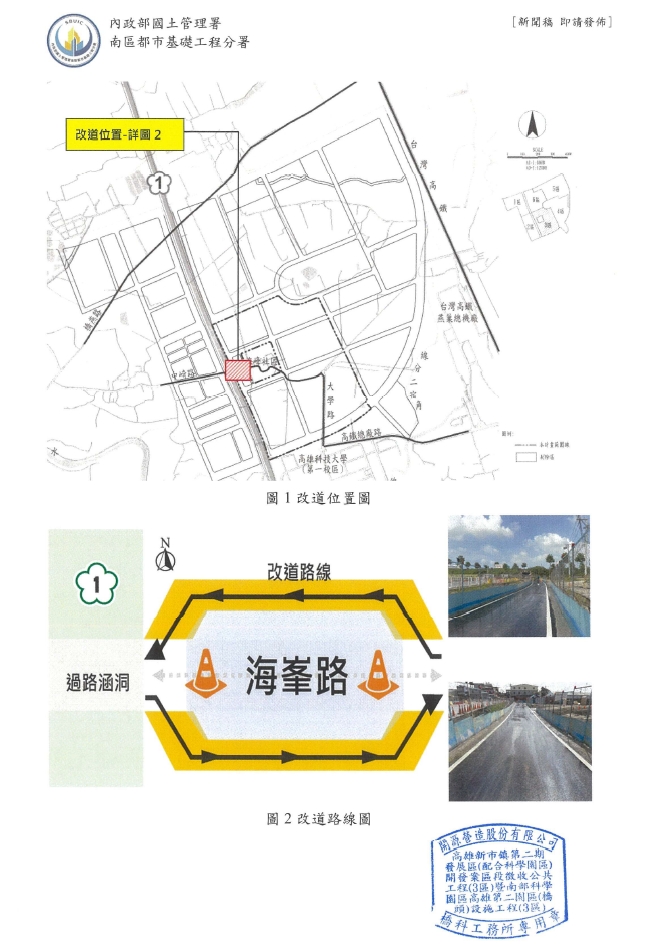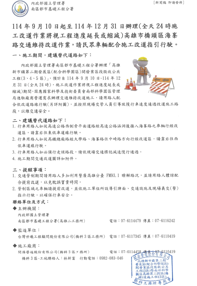 為配合「高雄新市鎮第二期發展區(配合科學園區)開發案區段徵收公共工程(3、4、5區)」施工,海峯路將進行交通維持改道作業,作業期程將視工程進度調整。