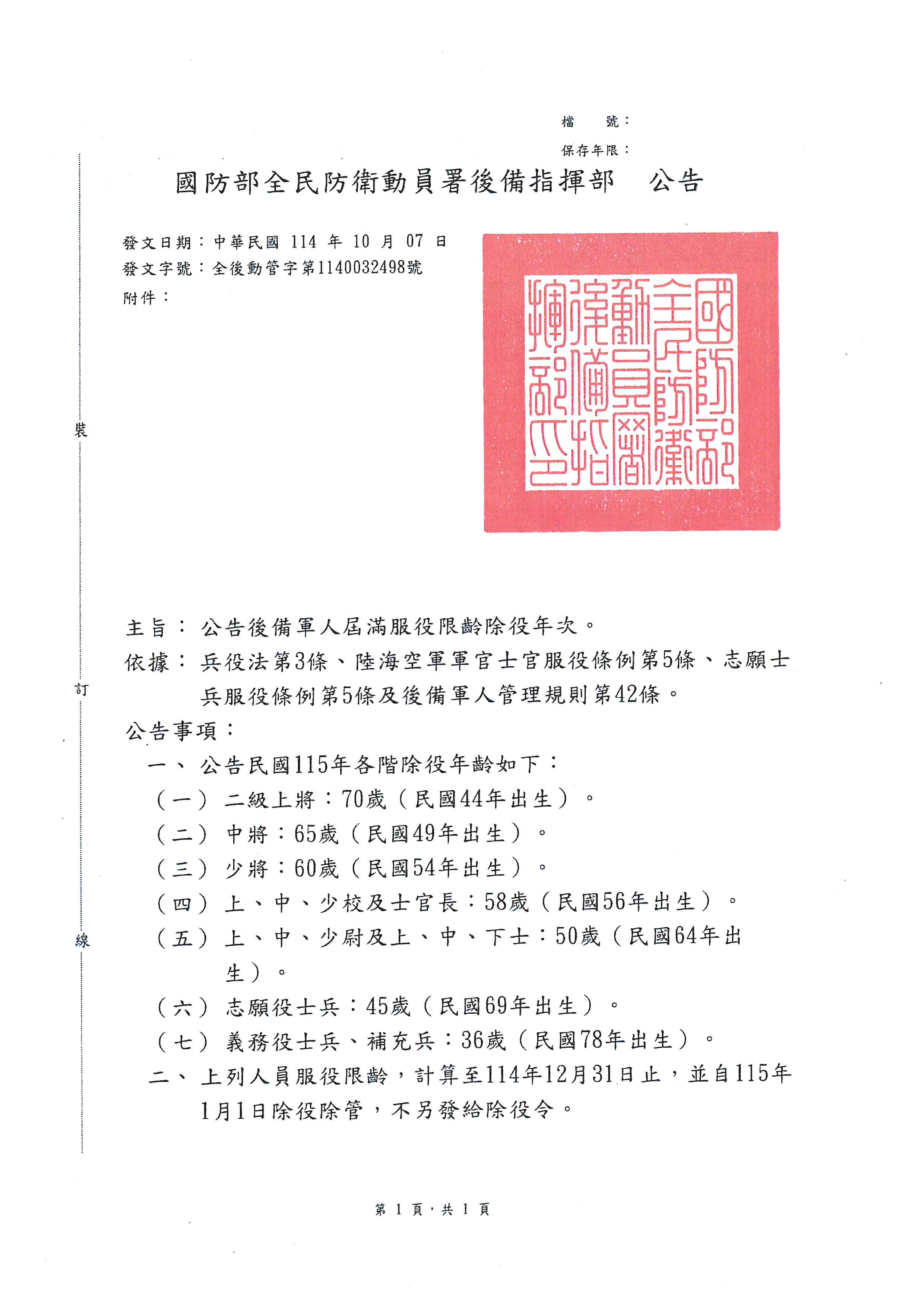 115年度後備軍人各階除役年齡公告宣導如下:二級上將70歲44年次、中將65歲49年次、少將60歲54年次、上、中、少校及士官長58歲56年次、上、中、少尉及上、中、下士50歲64年次、志願役士兵45歲69年次、義務役士兵、補充兵36歲78年次《高雄市橋頭區公所關心您》!