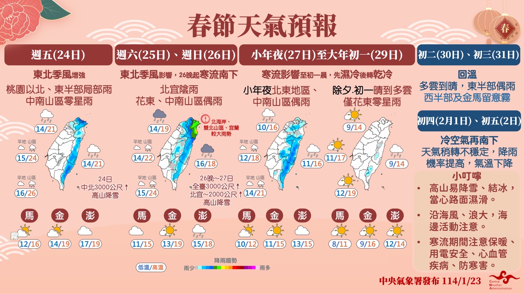 高市府災防辦通報:依據交通部中央氣象署最新預報顯示:受寒流南下影響,預計1月26日(日)晚上起,各地氣溫下降;預計1月27日(一)(小年夜)至1月29日(三)(大年初一)清晨受寒流影響,本市天氣非常寒冷,29日白天起寒流減弱,氣溫逐漸回升,日夜溫差大;另預計2月1-2日(六-日)(大年初四-大年初五),受大陸冷氣團南下影響,本市氣溫下降偏冷,日夜溫差大。請注意防範,加強保暖禦寒,使用瓦斯熱水器及電暖器具應注意室內通風及用電安全;預防低溫導致之呼吸道及心血管疾病、避免長時間逗留在寒冷環境,確保兒童之頭、頸、手和腳部溫暖,關懷老人、遊民及弱勢族群避寒措施;冬季為流感、呼吸道傳染病好發季節,請自主佩戴口罩、注意手部衛生與咳嗽禮節,落實生病在家休息;農作物、家禽畜牧及水產養殖業注意寒害,並注意中央氣象署最新天氣預報。